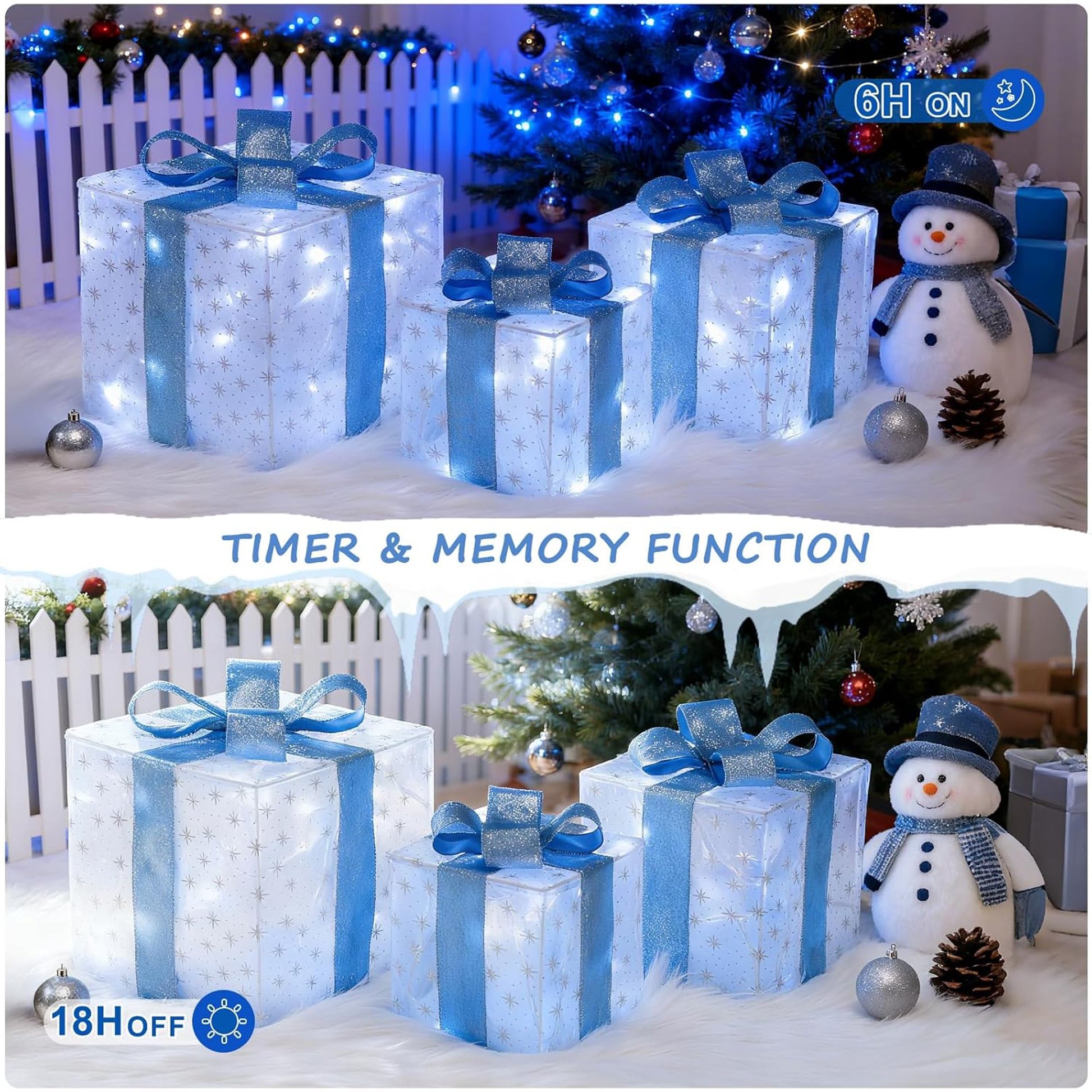 - ✨【A Magical Starry Night at Home】 Transform your space into a winter wonderland with these elegant Christmas Lighted Gift Boxes. Each one is crafted on a sturdy plastic frame, draped in shimmering silver starry mesh, and crowned with a beautifully woven blue bow. Powered by 60 ultra-bright cool white LEDs, the set of three creates a dazzling ambiance reminiscent of a glittering night sky, perfect for adding sophisticated charm to any room or display.