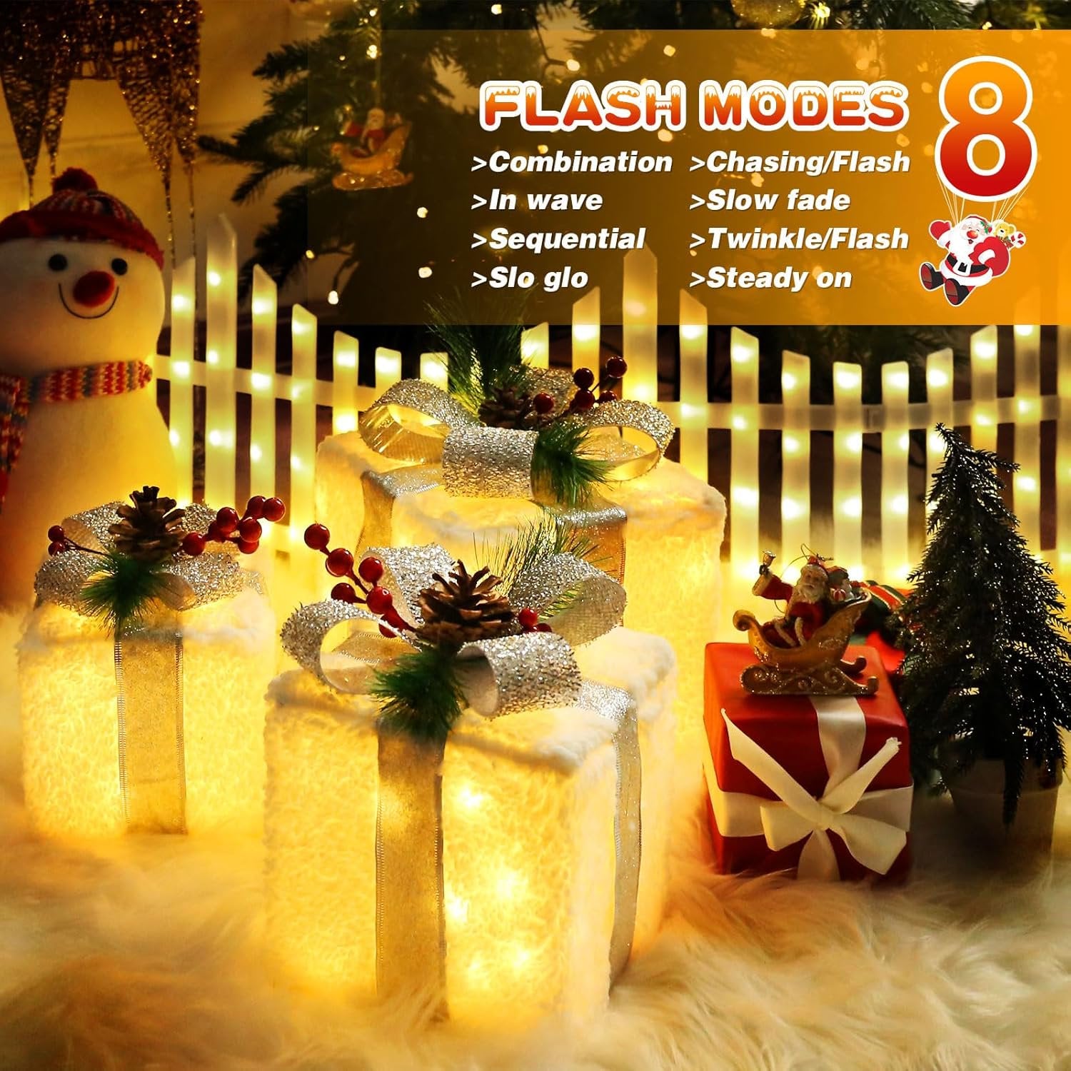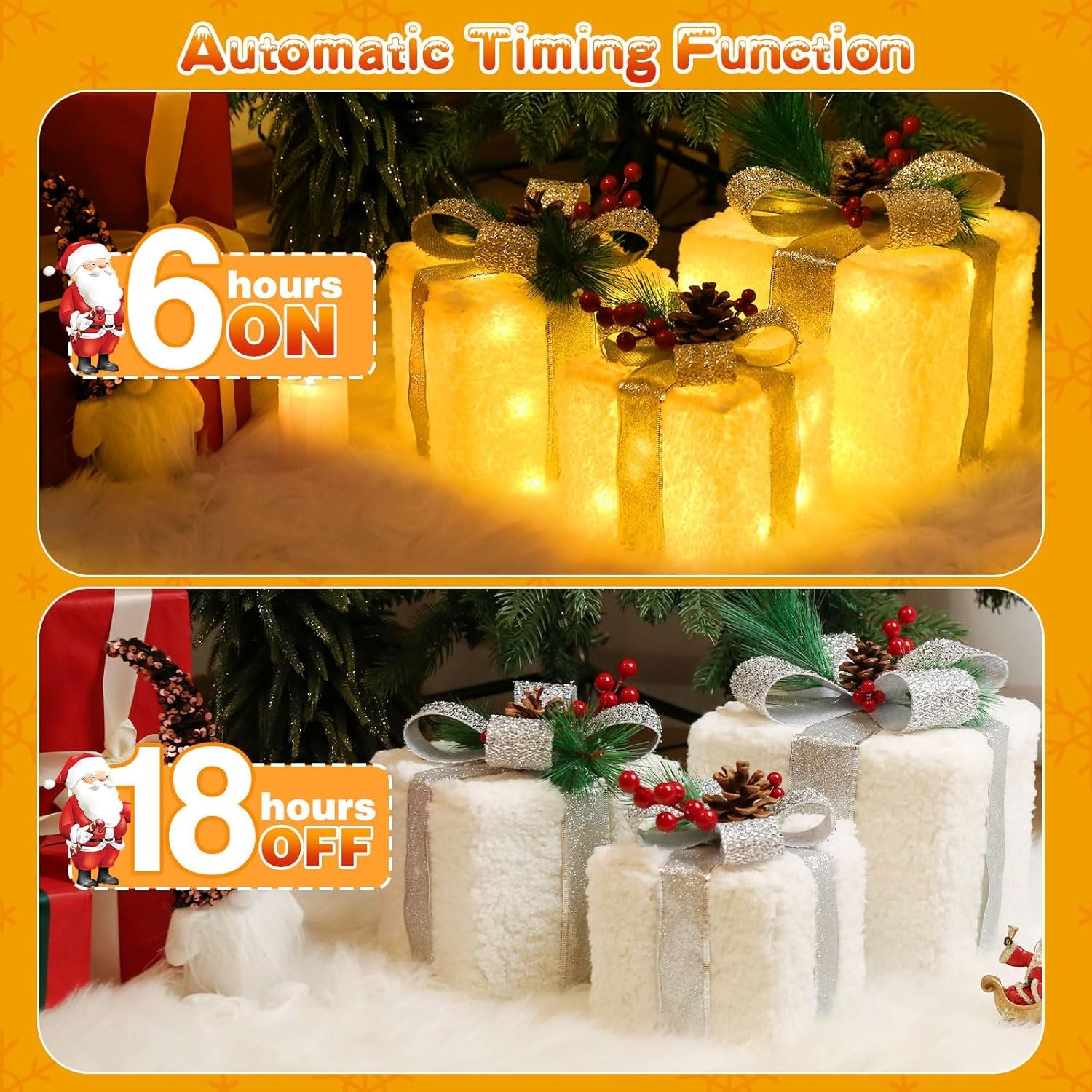 - đ đťă8 Modes & Auto-Timer FunctionăSimply switch on these Christmas Lighted Present Boxes to activate the convenient auto-timer. They will automatically turn off after 6 hours and restart 18 hours later, providing effortless daily ambiance. Choose from eight distinct lighting modes to craft your ideal festive atmosphere. Powered by a stable plug-in design, they offer brighter, more reliable light than battery-operated options, ensuring your Christmas nights are never without sparkle.