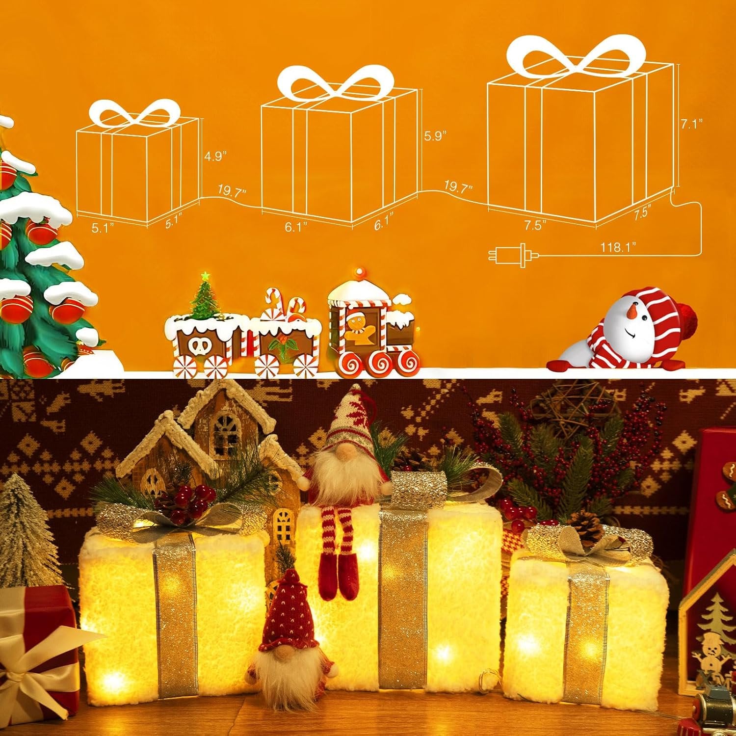 - đăSet of 3 Perfectly Proportioned BoxesăThis set includes three gracefully sized light-up boxesâLarge (7.5"x7.5"x7.5" with 25 LEDs), Medium (6.1"x6.1"x5.9" with 20 LEDs), and Small (5.1"x5.1"x4.9" with 15 LEDs). Connected by a single wire with 1.64ft between each and a generous 10ft lead, they offer flexible placement to weave sparkling holiday memories into any corner of your home.