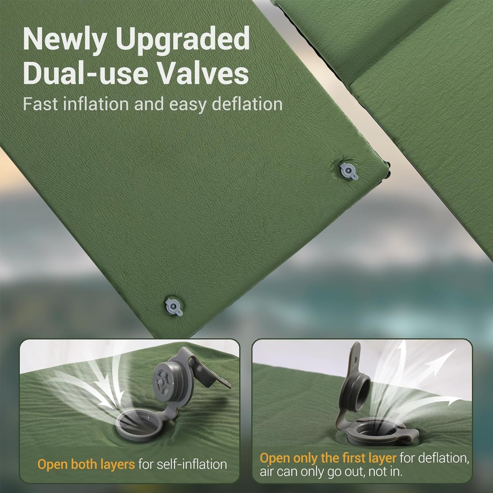 【Easy Storage with Upgraded Valves】-- Storing a foam pad has never been easier. Our dual-use valve system allows for quick inflation and effortless deflation. When inflating, simply open the two layers for self-inflating. To store, open the first valve layer (keep the second layer closed) and squeeze out the air. Compact and convenient, it’s perfect for on-the-go adventures.