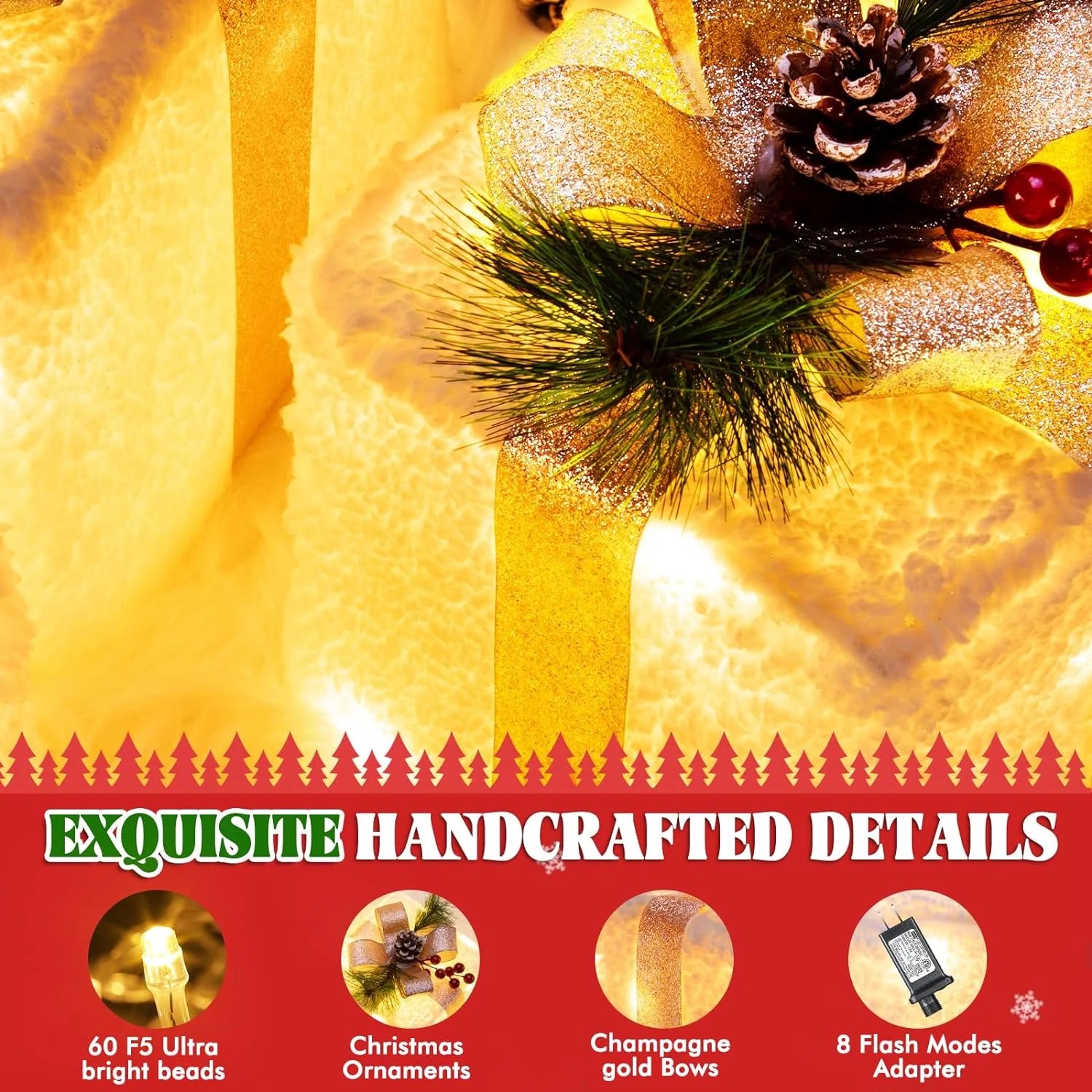 🎁 【8 Modes & Timer for Magical Christmas Lights】 - Features 60 internal warm white LEDs offering 8 dynamic lighting modes to set the perfect Christmas atmosphere. The built-in timer (6 hours on / 18 hours off) provides convenience and energy savings, automatically recreating the holiday magic every day.