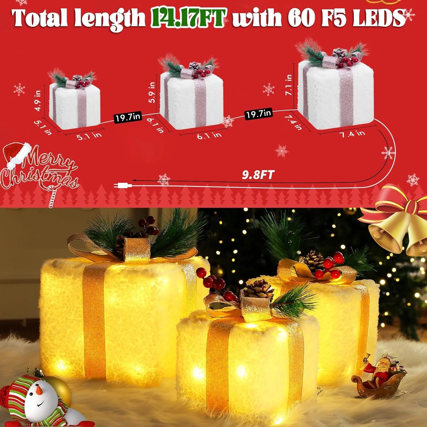 🎁 【Set of 3 Christmas Lighted Gift Boxes】 - Instantly create a festive focal point with our set of 3 pre-lit Christmas gift boxes in graduated sizes (Large: 7.4"x7.4"x7.1", Medium: 6.1"x6.1"x5.9", Small: 5.1"x5.1"x4.9"). The elegant champagne gold bows and velvety snow-like fabric add a touch of luxury to your holiday decor.